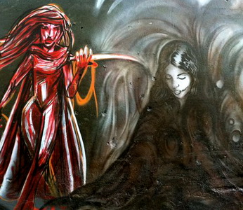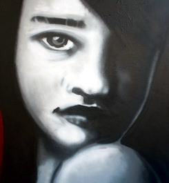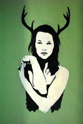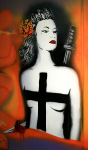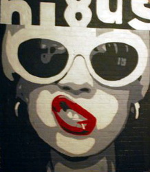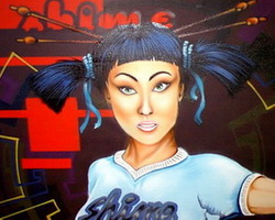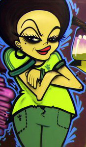 Her paintings often centre on feminine doll-like figures, that are aimed to soften a male dominated graffiti landscape whilst also questioning the perception of beauty from within a distorted media driven society.